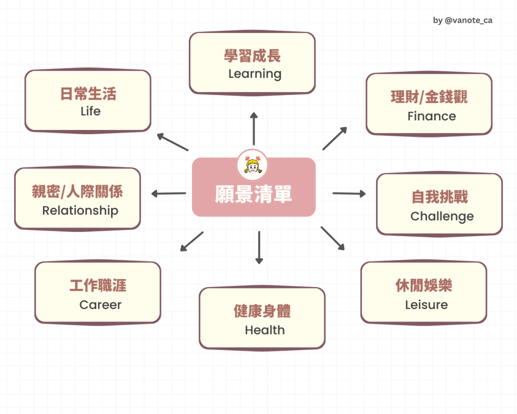 這個願景面向不是檢查表,也不是一定要把人生規劃完成的清單;你不一定要把這些都填滿,單純只是給完全沒有方向的人參考或是可以輔助你有一個更清楚的思考面向,以免你有什麼部分,是本來希望可以加入願景板但是沒有想到的地方💡