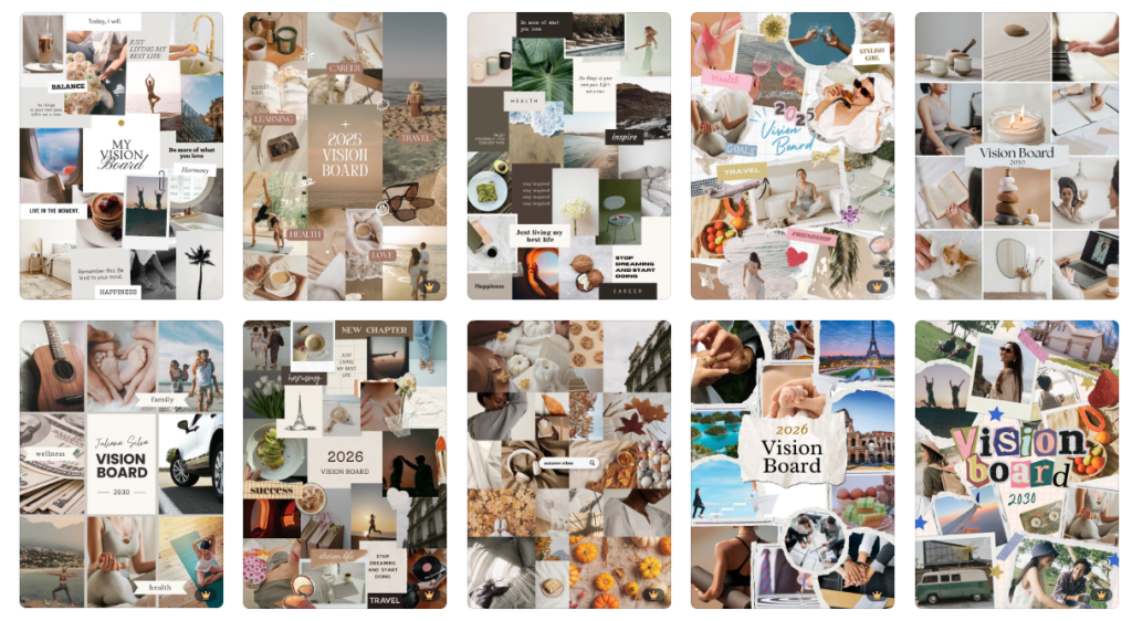 找圖片的同時,可以先統一整理在資料夾裡,之後開啟Canva或是其他你習慣使用的編輯圖片軟體工具,看你是想要列印出來,還是製作成電腦或是手機桌布大小,下面是我在Canva上參考的模板,有興趣可以試看看;如果想要做成不同尺寸,也可以用關鍵字在Canva搜尋 🔍 vision board for phone/desktop wallpaper